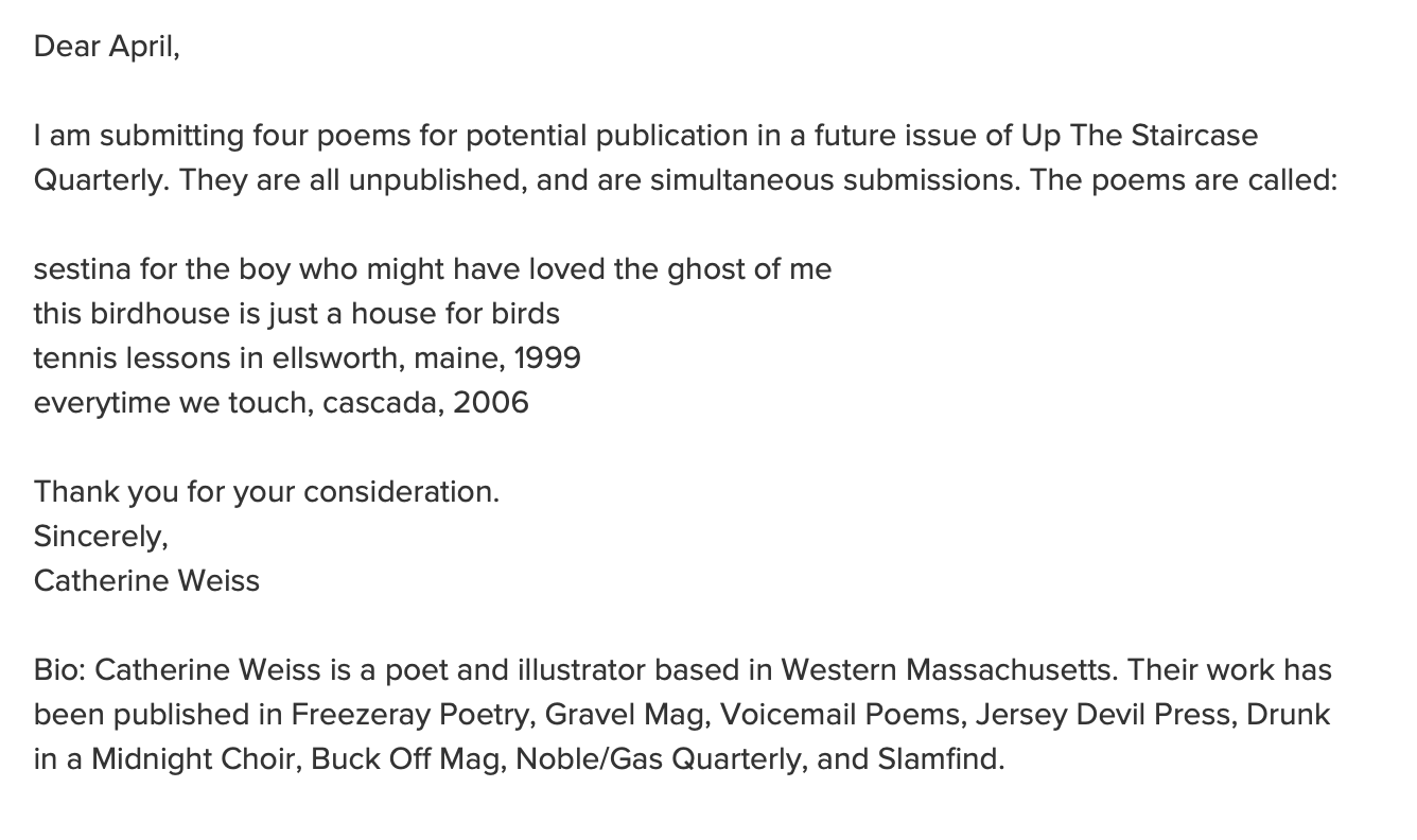 Jun 20, 2008 · wd senior editor and author of smash poetry journal robert lee brewer provides sample cover letters for poetry submissions and some tips for making your submissions stand out. To help you understand what a cover letter for document submission looks like, we've put together a short cover letter to show you the structure. Cover letter template journal resume cover letter. (if applicable) research and manuscript related details. Aug 27, 2021 · cover letter examples journal submission. A very brief ( A cover letter is the tool introducing to the journals editors your submission and offers a brief overview of major details and its contents. You can use your cover letter to describe your study, its importance and why it will be interesting to the journal's readers. The first thing you need to do is check your target journal's author instructions for the cover letter requirements. After more than 12 years of writing, i finally felt confident enough to start submitting my poetry around for publication in january of 2006. Research article, review article, short communication, letters, editorials) Unless you have letterhead, which is not necessary, type your address followed by the date. You might find that the submission system for your chosen journal requires your cover letter to be submitted into a text box rather than as a separate document, but it is still a good idea to write a draft first to make sure.